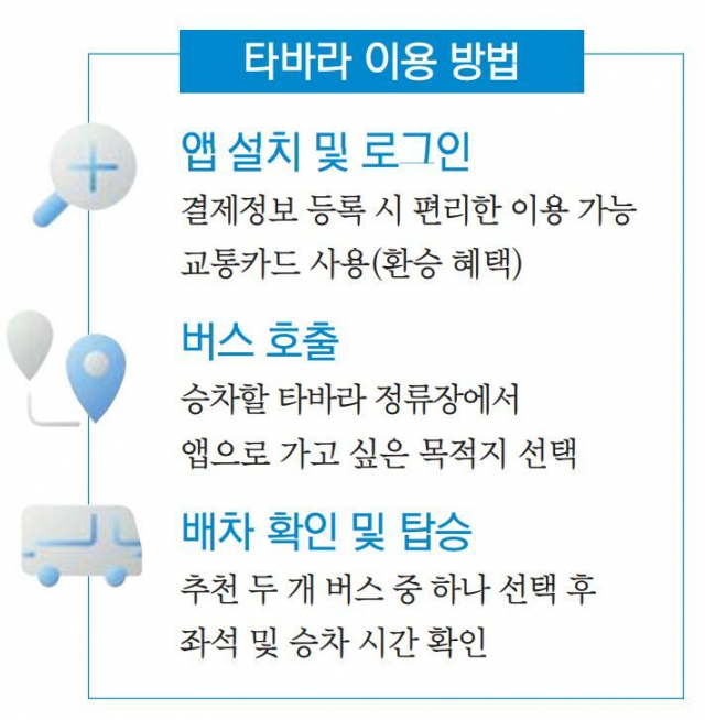 부산형 수요응답형 교통(DRT) 타바라는 시내버스의 대량수송과 택시의 높은 접근성을 결합한 관광용 DRT이다. 승객이 필요한 시간에 정해진 정류장으로 버스를 부르는 탄력적인 시스템으로 운영돼 비용 절감이 장점으로 꼽힌다. 세종시와 청주 등 일부 지역에서 DRT가 활발히 운영 중인데, 부산에서는 이번에 처음 시행된다. 문화체육관광부 공모사업으로 국·시비 15억 8000만 원이 투입돼 1년간 시범 운영한다.