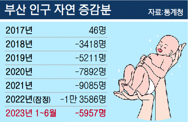 이에 따라 부산 인구 자연 증감분은 2017년 46명 증가를 기록한 이후 줄곧 내리막이다. 2018년 -3418명, 2019년 -5211명, 2020년 -7892명, 2021년 -9085명, 2022년(잠정) -1만 3586명으로 6년째 감소 중이다.