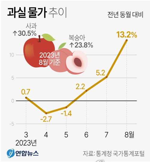 지난 달 사과 가격은 1년 전에 비해 30.5% 올랐고 복숭아 가격은 23.8%, 쌀 가격은 7.8% 상승했다.