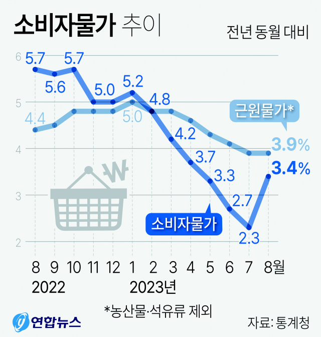 폭염·폭우 등 이상기후 영향으로 1년 전보다 농산물 가격이 3.5%, 수산물 가격이 6.5%나 올랐다. 석유류 가격은 10.9% 하락했으나 전기·가스·수도비가 19.5%, 서비스비가 3.0% 올라 전체 지수를 끌어올렸다.