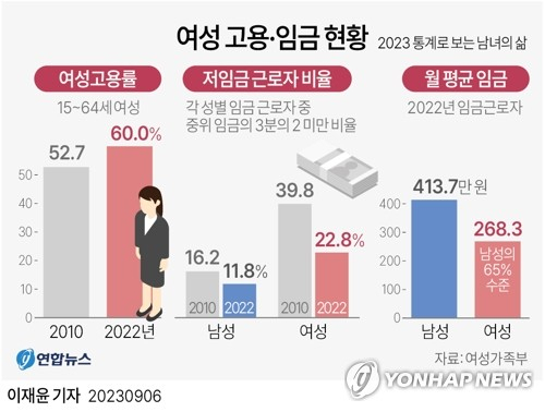2022년 15∼64세 여성 고용률은 60.0%로, 2010년(52.7%)보다 7.3%포인트 상승해 처음으로 60%대에 진입했다. 하지만 여성 임금 근로자 중 저임금(중위 임금의 3분의 2 미만) 근로자는 22.8%로, 남성 저임금 근로자 비율(11.8%)의 2배가량에 달했다. 저임금 근로자 비율은 2010년 남성 16.2%, 여성 39.8%였는데, 12년 새 각각 4.4%포인트(P), 17.0%P 줄었다.