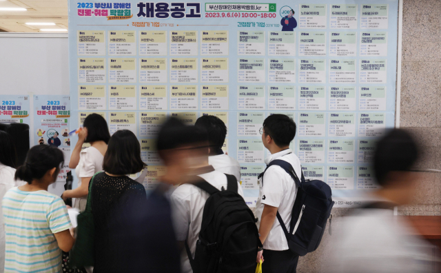 장애인 구직자들이 6일 부산시청에서 열린 '2023 부산 장애인 진로·취업 박람회'에서 채용 공고 게시판을 살펴보고 있다. 이번 박람회에는 부산은행, 쿠팡 등 60개 기업이 참가했다. 정종회 기자 jjh@