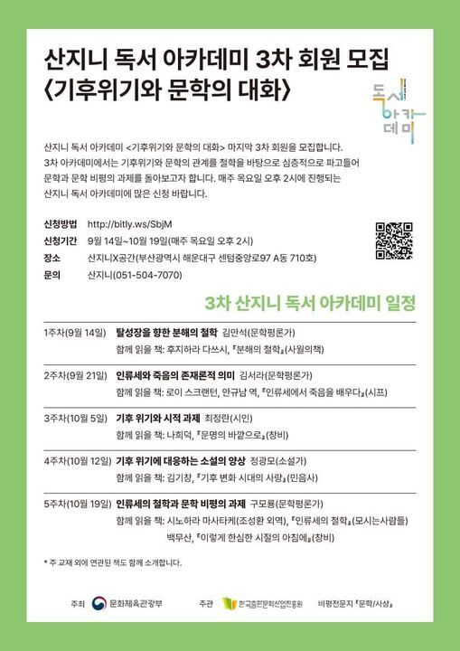 14일 ‘탈성장을 향한 분해의 철학’(김만석 문학평론가), 21일 ‘인류세와 죽음의 존재론적 의미’(김서라 문학평론가), 10월 5일 ‘기후 위기와 시적 과제’(최정란 시인), 10월 12일 ‘기후 위기에 대응하는 소설의 양상’(정광모 소설가), ‘인류세의 철학과 문학 비평의 과제’(구모룡 문학평론가). 각 아카데미마다 <인류세의 철학> <이렇게 한심한 시절의 아침에> 등 함께 읽을 책을 정해놨다. 참가비 무료. 051-504-7070.
