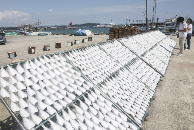 지난 11일 부산 기장군 일광면 칠암 물양장에서 가자미가 가을 햇볕에 건조되고 있다. 어민들은 가을을 맞아 각종 생선들을 손질해 건조대에 널어 말리기 시작했다. 연합뉴스