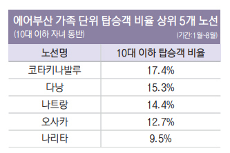 에어부산, 노선별 탑승객 분석 10대 이하 탑승객 비율 17.4%