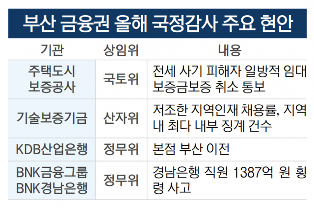 그간 중앙에서 발생한 현안을 중심으로 국정감사가 진행돼 부산 금융권은 무풍지대로 여겨져왔다. 하지만 올해는 지역에서 크고 작은 이슈들이 연달아 발생해 국정감사 증인 채택에 촉각을 곤두세우고 있는 모습이다.