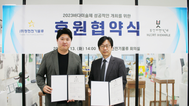 (사)부산비엔날레조직위원회(위원장 박형준)는 ㈜정현전기물류(대표 오상훈)와 13일 2023 바다미술제의 성공적인 개최를 위해 후원 협약식을 가졌다.