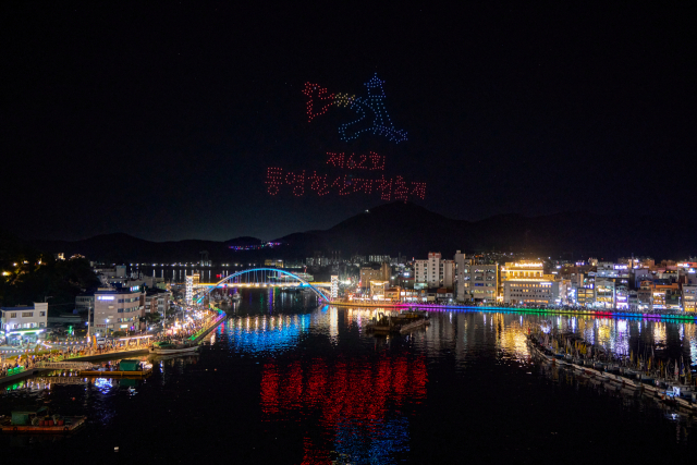 지난달 열린 제62회 통영한산대첩축제 개막식 모습. 축제의 서막을 알리는 드론쇼가 통영의 밤하늘을 수놓고 있다. 부산일보DB