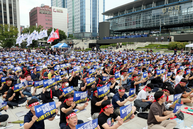 철도노조는 14일 오전 9시부터 18일 오전 9시까지 5일간 한시 파업에 들어갔다. 철도노조 부산본부는 14일 오전 11시 부산역 광장에서 총파업 출정식을 열었다. 다른 지역에서도 총파업 출정식이 진행됐다. 철도노조는 이번 파업에 필수 유지인력 9000여 명을 제외한 조합원 1만 3000여 명이 참여한다고 밝혔다. 국토부는 “오늘 출근대상자 1만 2905명 중 2804명이 파업에 참가해 참가율이 21.7%였다”며 “14일 오후 3시 기준으로 열차는 평시대비 76.4% 운행 중”이라고 밝혔다. KTX는 76.4%, 새마을·무궁화호 등 일반열차 68.1%, 화물열차 26.3%가 운행중이라는 설명이다.