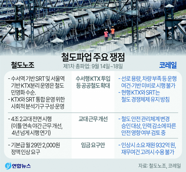 철도노조는 △수서행 KTX 투입 등 공공철도 확대 △4조 2교대 전면 시행 △성실 교섭 등을 촉구하고 있다. 며칠 전까지 주장하던 철도민영화 반대, 코레일과 SR 통합에 대해선 별 목소리를 내지 않았다. 노조는 오는 18일 오전 9시까지 1차 총파업을 진행할 예정이고 정부와 코레일의 입장을 지켜보며 제2차 파업 여부를 결정한다고 밝혔다.