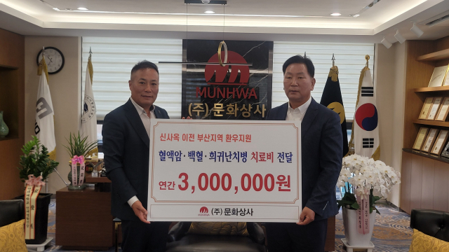 (주)문화상사(회장 박중우)는 14일 부산 동래구 온천동 신사옥에서 (사)한국혈액암백혈병협회(회장 정만채)에 후원금 300만 원과 직원 헌혈 캠페인 등으로 모은 헌혈증서 100매를 전달했다.