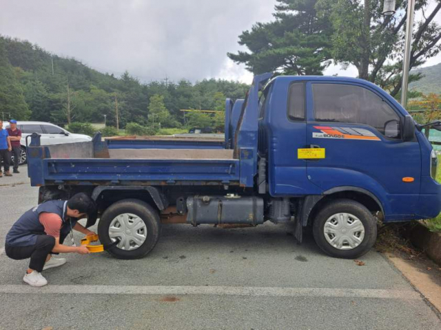 양산시가 18일 지방세를 체납한 S개발 소유의 차량을 압류하고 있다. 양산시 제공