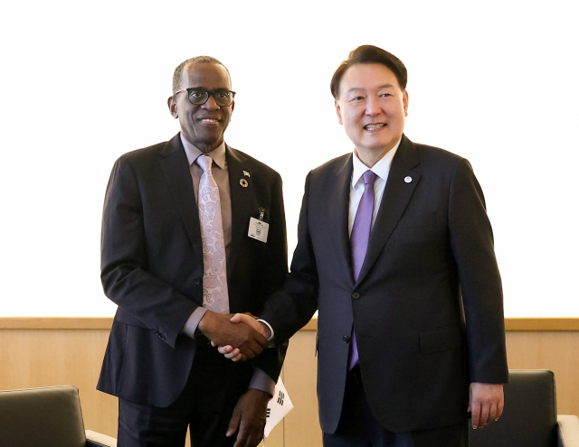 윤석열 대통령이 18일(현지시간) 뉴욕에서 필립 조셉 피에르 세인트루시아 총리와 회담하고 있다. 연합뉴스