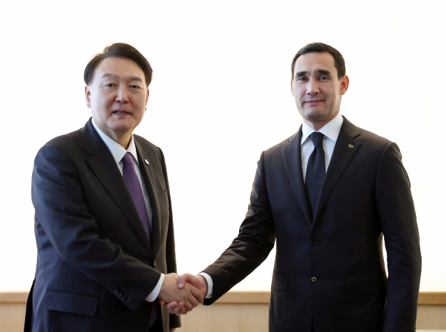 윤석열 대통령이 18일(현지시간) 뉴욕에서 열린 세르다르 베르디무하메도프 투르크메니스탄 대통령과 회담하고 있다.