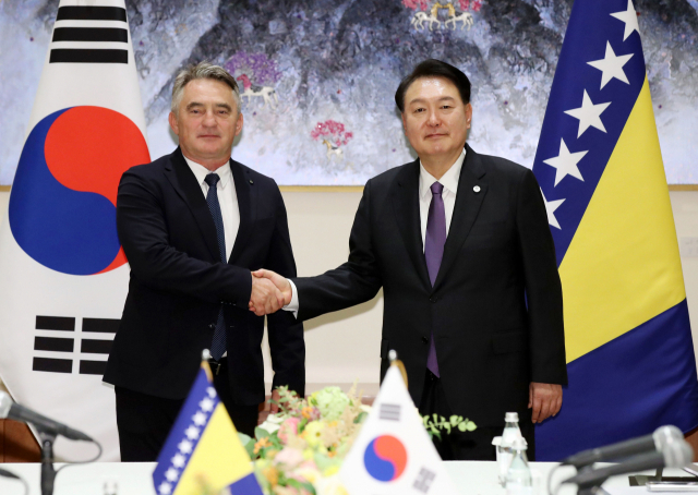윤석열 대통령이 18일(현지시간) 뉴욕에서 젤코 콤시치 보스니아 헤르체고비나 대통령과 회담하고 있다.