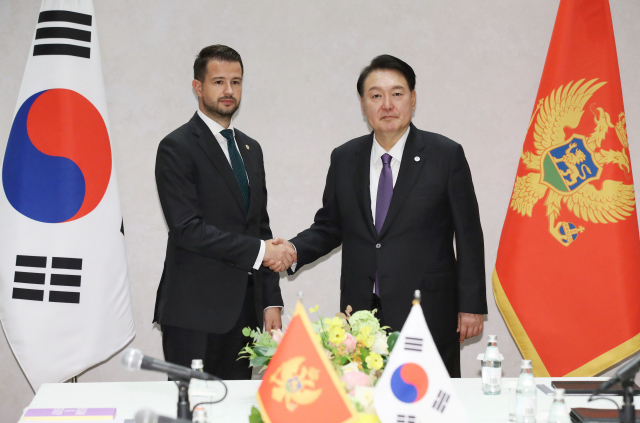 윤석열 대통령이 18일(현지시간) 뉴욕에서 야코브 밀라토비치 몬테네그로 대통령과 회담하고 있다.