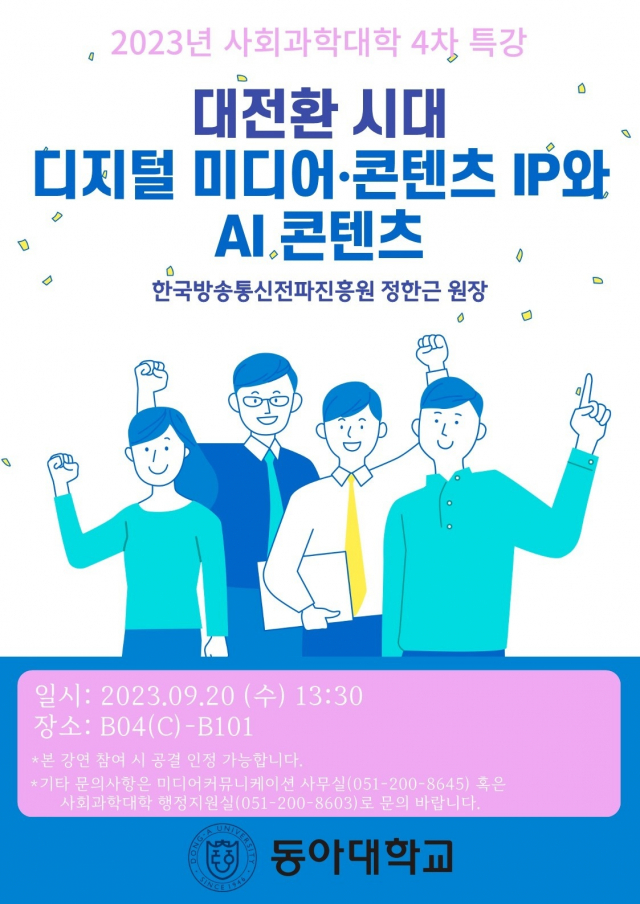 이번 특강에 대한 보다 자세한 내용은 동아대 사회과학대학(051-200-8603)이나 미디어커뮤니케이션학과(051-200-8645)로 문의하면 된다.