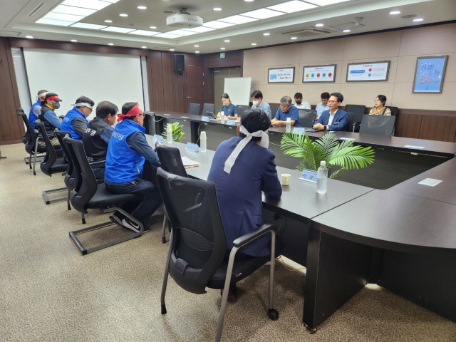 부산 기장군 일광읍 주민들은 19일 오전 부산 서구 한국전력 남부건설본부 앞에서 송전선로 건설 반대 집회를 연 뒤 본부 관계자들과 면담을 가졌다. 일광읍현안대책위원회 제공