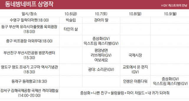 10월 6~9일 ‘동네방네비프’도 부산 곳곳에서 열린다. 올해는 무료로 영화 16편을 상영한다. 강서구 김해국제공항 국제선 격리대합실, 동구 부산역 유라시아플랫폼 옥외광장, 동래구 동래향교, 부산진구 부산시민공원 방문자센터, 수영구 밀락더마켓, 영도구 영도 조내기 고구마 역사기념관, 중구 비프광장 야외무대가 영화관이 된다. 김해국제공항에는 해외로 떠나는 탑승객이 영화를 즐길 수 있도록 스크린이 설치된다.