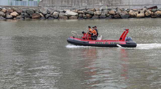 21일 부산 수영구와 해운대구 사이 수영강에서 소방대원들이 구조보트를 동원해 전날 온천천에서 불어 난 물에 휩쓸려 실종된 여성을 찾는 수색작업을 벌이고 있다. 김종진 기자 kjj1761@