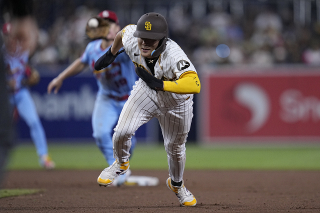 1회 무사 2루에서 첫 타석에 나선 김하성은 우익수 방면 큰 타구를 날렸다. 세인트루이스 우익수 조던 워커가 잡을 듯했으나, 공은 글러브 맞고 떨어졌다. 그사이 김하성은 2루까지 진루했다. 우익수 실책이 기록됐다. 곧바로 후안 소토의 3점 홈런이 터져 김하성은 홈을 밟았다.