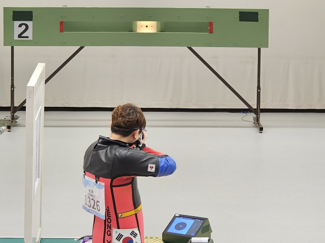 26일 중국 항저우 푸양 인후 스포츠센터에서 열린 2022 항저우 아시안게임 사격 남자 10m 러닝타깃(혼합) 단체전 경기에서 한국 대표팀 정유진이 후반 경기를 치르고 있다. 항저우=김한수 기자 hangang@