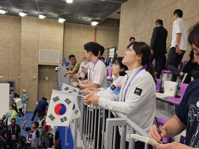 26일 중국 항저우 푸양 인후 스포츠센터에서 열린 2022 항저우 아시안게임 사격 남자 10m 러닝타깃(혼합) 단체전 경기에는 장미란 문화체육관광부 차관이 방문해 한국 선수들을 응원했다. 항저우=김한수 기자 hangang@