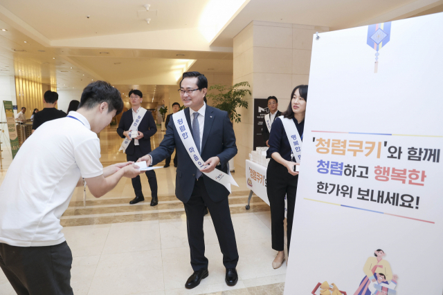 권남주 캠코 사장과 이승우 한국남부발전(주) 사장은 출근길 공공기관 임직원들을 대상으로 추석 한가위 인사를 전하며 준비한 ‘청렴쿠키’와 ‘이해충돌방지법 홍보 리플릿’을 직접 전달했다.