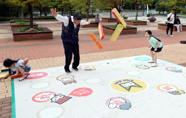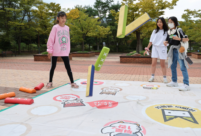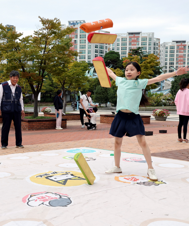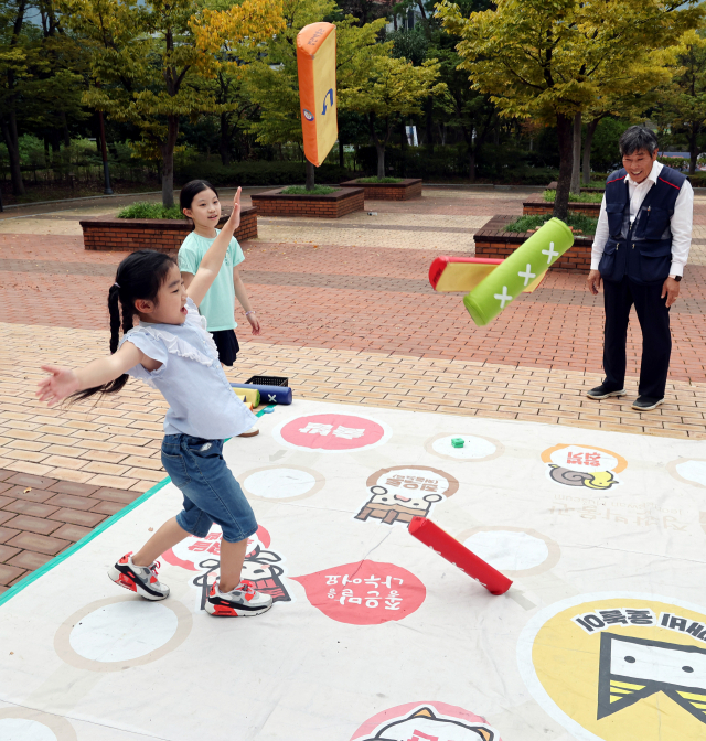 추석 연휴인 30일 오후 부산 기장군 정관박물관을 찾은 가족단위 시민들이 박물관 야외마당에서 윷놀이, 투호, 제기차기 등 민속놀이를 하며 즐거운 시간을 보내고 있다.