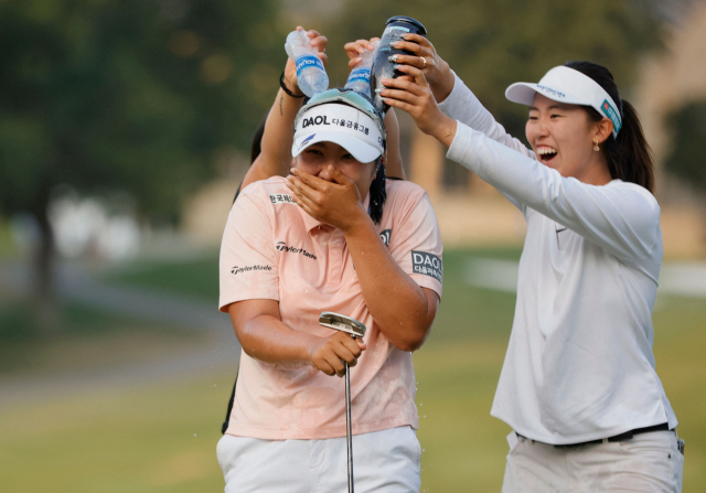 2일(한국시간) 끝난 미국여자프로골프(LPGA) 투어 월마트 NW 아칸소 챔피언십에서 생애 첫 우승을 차지한 유해란이 동료들의 물병 축하를 받고 있다. AFP연합뉴스