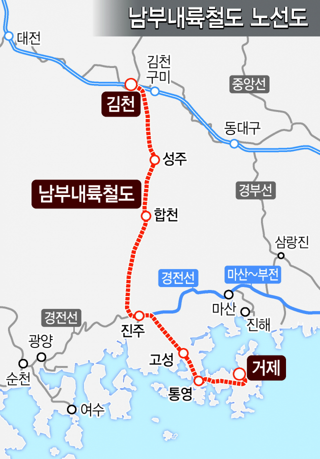한편, 남부내륙철도는 국토교통부의 ‘철도망 구축계획(2016~2025)’에 따라 경부고속철도 김천 구간(경부선 김천역)에서 분기해 거제로 연결되는 여객 전용 단선철도다. 거제시 사등면 종착을 기준으로 총연장 177.89km다. 철도가 개통하면 서울과 거제 간 이동 시간은 종전 5시간에서 2시 40분대로 단축된다.