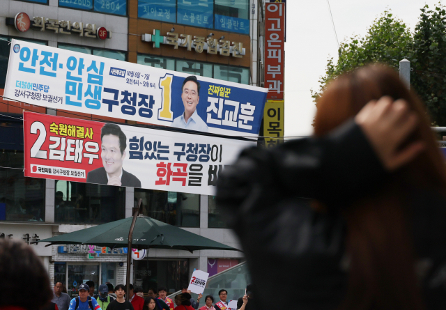 내년 4·10 총선의 전초전 성격을 띠는 서울 강서구청장 보궐선거(11일)를 앞둔 지난 3일 서울 강서구 화곡역 교차로에 후보들의 현수막이 내걸려 있다. 연합뉴스