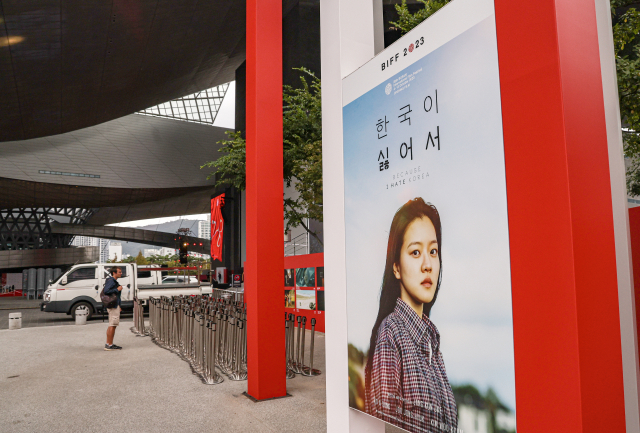 제28회 부산국제영화제(BIFF) 개막을 하루 앞둔 3일 오후 부산 해운대구 영화의전당 비프힐 앞 거리에 상영작을 소개하는 대형 입간판이 설치돼 영화제 분위기를 고조시키고 있다. 김종진 기자 kjj1761@