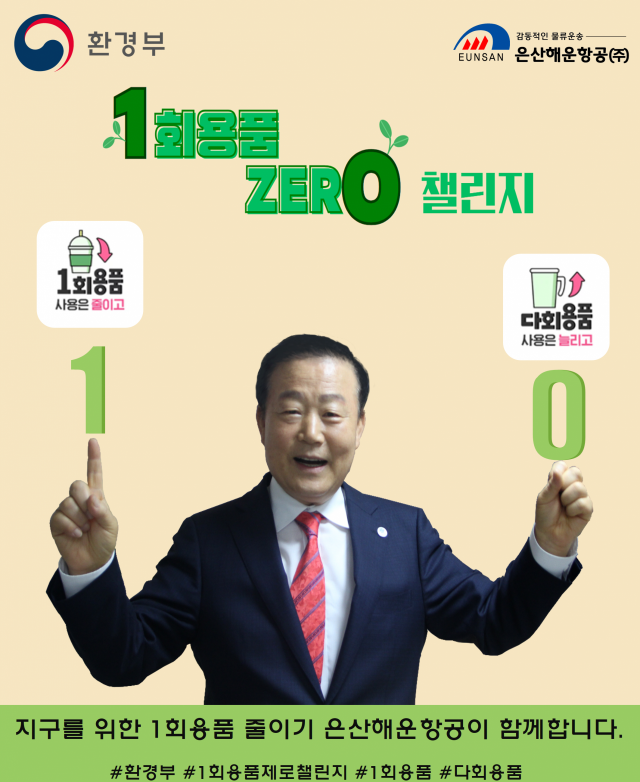 은산해운항공(주) 양재생 회장은 4일 환경부가 일상 생활 속에서 일회용품 사용을 줄이는 다짐을 릴레이 방식으로 확산하는 ‘일회용품 제로 챌린지(일회용품 없애기 도전)’에 동참했다.