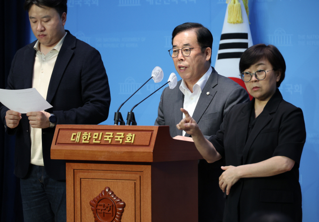 국회 과학기술정보방송통신위원회 국민의힘 간사인 박성중 의원이 4일 국회에서 포털 ‘다음’ 매크로 조작 관련 기자회견을 하고 있다(위). 더불어민주당 홍익표 원내대표가 4일 진교훈 강서구청장 보궐선거 후보 사무소에서 열린 현장 최고위원회의에서 발언하고 있다. 연합뉴스