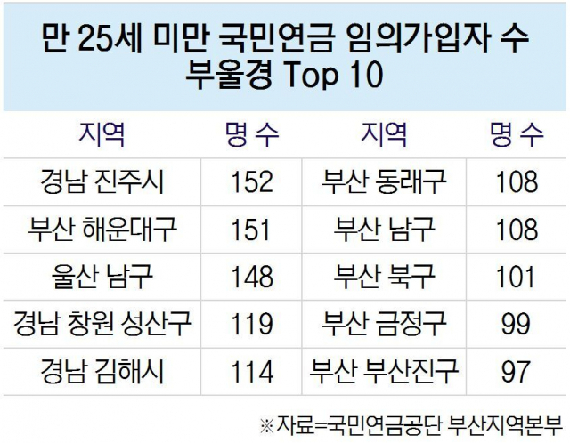 국민연금공단 부산지역본부에 따르면, 부산·울산·경남지역의 국민연금 가입자 중 만 25세 미만 임의가입자 수가 가장 많은 곳은 경남 진주시, 부산 해운대구, 울산 남구로 나타났다. 그다음으로 경남 창원시 성산구, 경남 김해시, 부산 동래구, 부산 남구, 부산 북구, 부산 금정구, 부산 부산진구 순이었다. 임의가입자 수가 많은 지역은 인구수의 영향도 있으나, 대체로 소득 수준이 높은 곳과도 경향성을 보이는 것으로 해석된다. 임의가입자의 경우 소득이 없는 만큼, 통상 부모나 배우자가 보험료를 내는 경우가 대부분이다. 다만, 임의가입자의 가입 요건이 사업장·지역 가입자에 속하지 않으면서 소득이 없는 경우인 만큼, 전체 가입자 수에서 차지하는 비중은 1.5% 수준으로 크지 않다.
