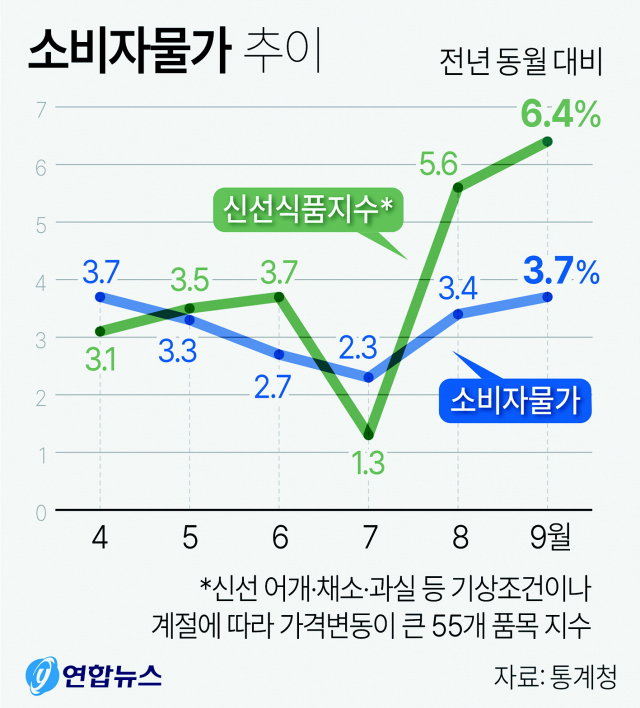 9월 소비자물가 3.7% 상승…5개월 만에 최고 상승률 기록