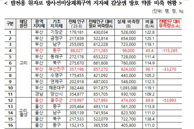 고리 원전은 부산시 동구·부산진구, 월성 원전은 울산시 울주군과 경북 경주시·포항시, 한울 원전은 경북 울진군·봉화군과 강원 삼척시, 한빛 원전은 전남 무안군·장성군·함평군과 전북 부안군이 지자체 전체 인구 대비 갑상샘 방호 약품 최소 비축량에 도달하지 못했다. 특히 경북 포항시(0.6%)와 전남 무안군(0.3%)은 전체 인구 대비 갑상샘 방호 약품 비축량이 1%도 되지 않는 것으로 파악됐다.