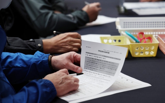 5일 부산 영도구청에서 열린 ‘2023 영도구 채용박람회’에서 참가자들이 구직표를 작성하고 있다. 이번 박람회에서는 유관기관 취업 지원제도 홍보, 이력서 작성, 면접기법 지도 등이 진행됐다.