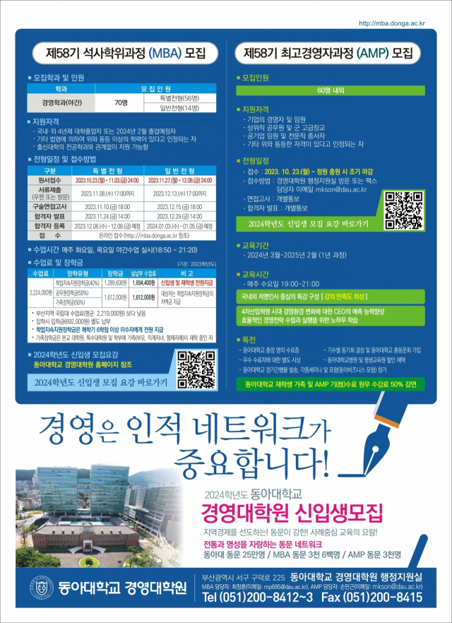 입학에 관한 자세한 사항은 경영대학원 홈페이지(http://mba.donga.ac.kr)를 참고하거나 행정지원실(☎051-200-8412~3)로 문의하면 된다.