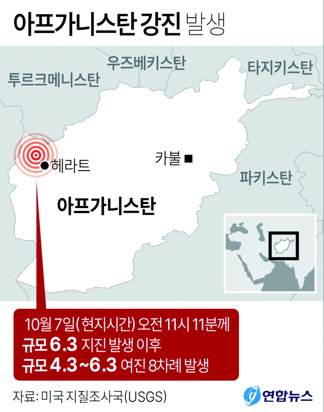 미국 지질조사국(USGS)에 따르면 7일 오전 아프간 북서부에서 규모 6.3의 강진이 발생했고 그 후에도 규모 4.3에서 6.3 사이의 여진이 여덟 차례 이어졌다. 진앙은 헤라트주 주도 헤라트 북서쪽 40km 지점이고 진원 깊이는 14km로 비교적 얕았다.