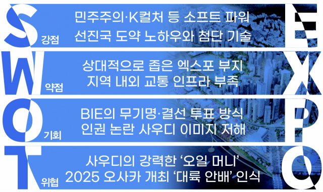 2030세계박람회(월드엑스포) 개최지 결정이 50일 앞으로 다가왔다. 부산의 경쟁 도시는 사우디 리야드와 이탈리아 로마 두 곳이지만 가장 먼저 유치전에 뛰어든 리야드와 그 뒤를 쫓는 부산의 2파전으로 굳어지고 있다. 부산의 최종 유치에 변수가 될 요인은 어떤 것들이 있는지, 기업의 경영전략 수립에 널리 활용되는 ‘SWOT 분석 기법’을 통해 부산의 강점과 약점, 기회와 위협 요인을 짚어봤다.