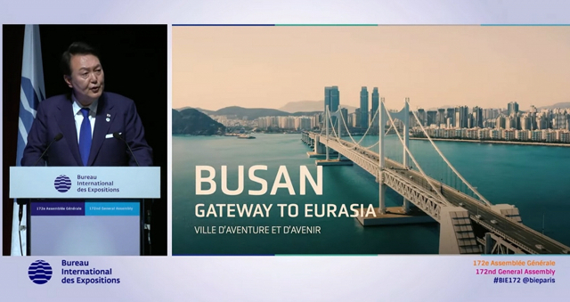 지난 6월 20일(현지 시간) 프랑스 파리에서 열린 제172차 국제박람회기구(BIE) 총회장에서 4차 경쟁 프레젠테이션(PT)을 하는 윤석열(위) 대통령과 파이샬 빈 파르한 알사우드 사우디 외교장관. 연합뉴스