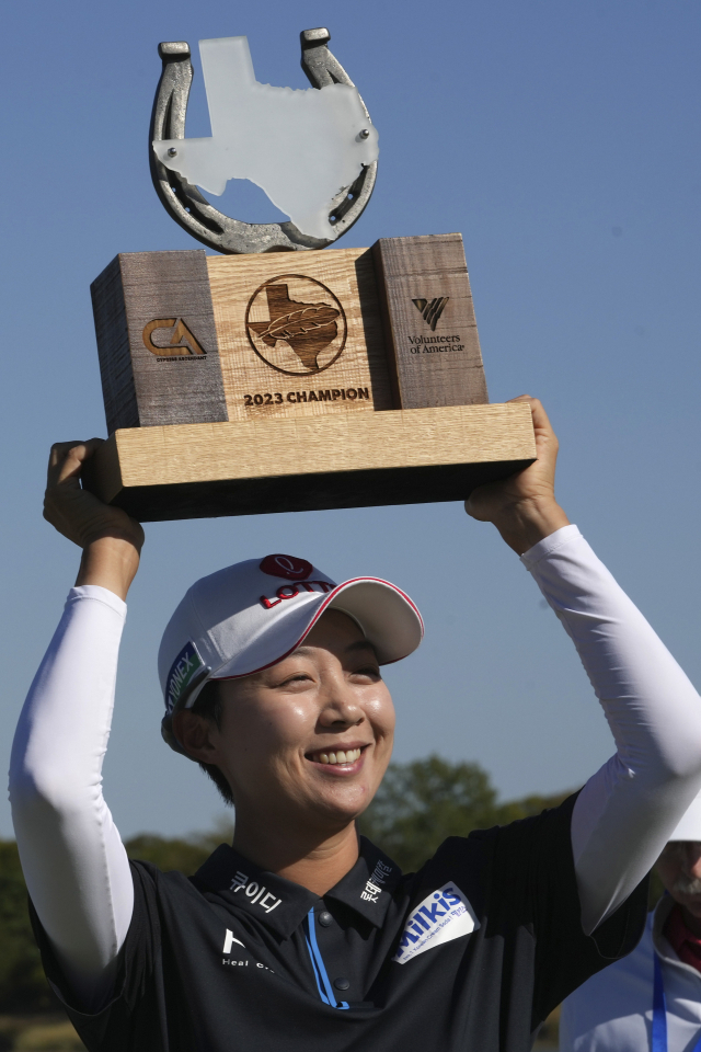 9일(한국시간) 미국 텍사스주 더콜로니에서 열린 LPGA 투어 어센던트 LPGA에서 시즌 첫 승을 거둔 김효주가 환하게 웃으며 우승 트로피를 들어 올리고 있다. AP연합뉴스
