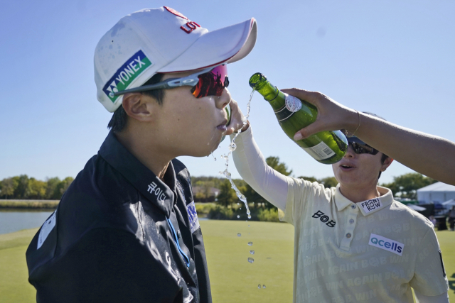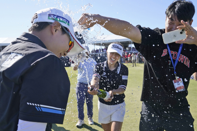 9일(한국시간) 미국 텍사스주 더콜로니에서 열린 LPGA 투어 어센던트 LPGA에서 시즌 첫 승을 거둔 김효주가 동료들의 축하를 받고 있다. AP연합뉴스