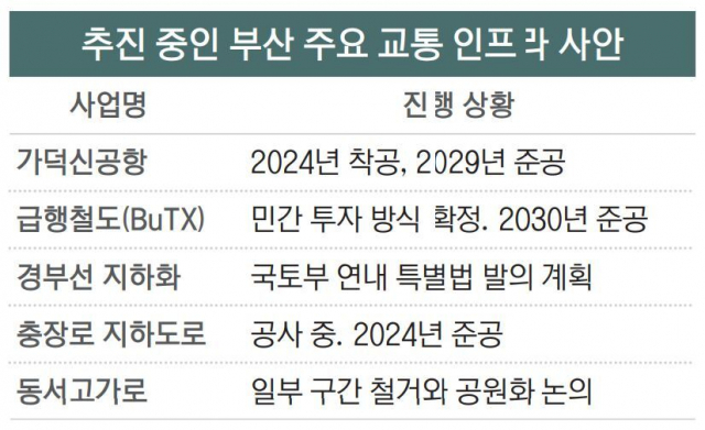부산의 교통 시설과 관련해 현재 가장 뜨겁게 논의되는 안건은 ‘경부선 철도 지하화’다. 국토교통부는 경부선 철도 지하화 사업 추진을 위한 특별법을 연내 발의할 계획이다. 원희룡 국토부 장관이 최근 직접 “‘도시 지상철도 지하화(가칭)’ 특별법을 발의하겠다. 법안이 국회를 통과하면 시범사업 대상지로 수도권 외에 부산이 가장 유력하다”고 밝히기도 했다.