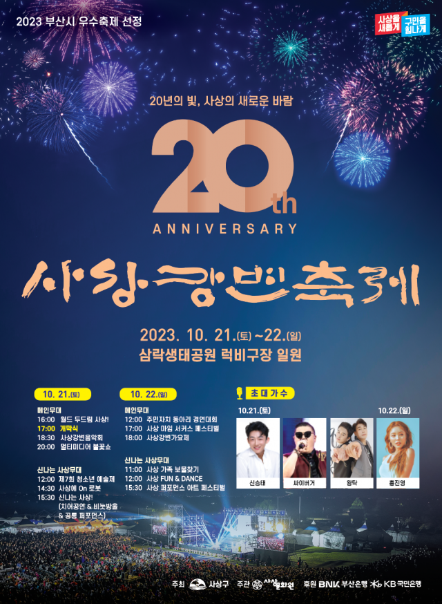 조병길 사상구청장은 “올해로 20회를 맞이한 사상강변축제가 부산의 대표 축제로 자리매김하도록 준비에 만전을 기하겠다”며 “사상강변축제에서 가을 정취도 느끼고 잊지 못할 추억을 만들었으면 한다”고 말했다.