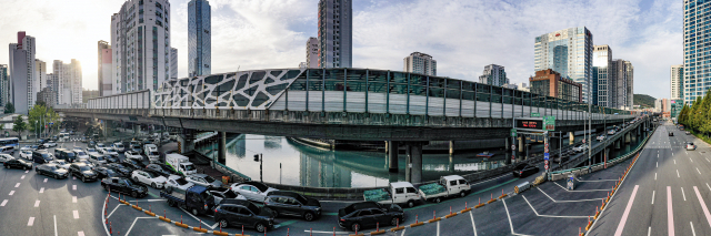 지난 6일 출근 시간대 부산 동서고가로 범내골램프. 김종진 기자 kjj1761@