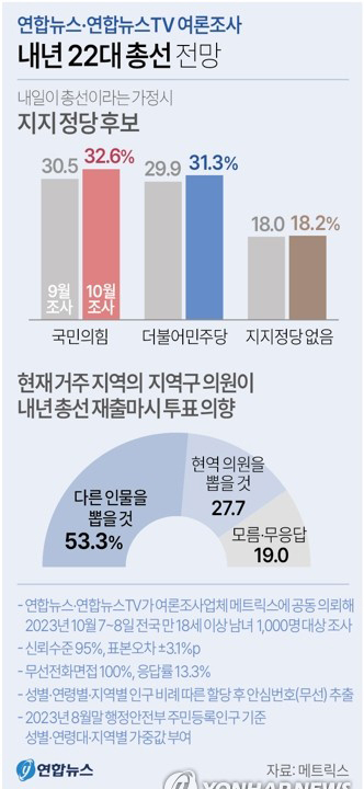 연합뉴스와 연합뉴스TV가 공동으로 여론조사 업체 메트릭스에 의뢰해 지난 7~8일 전국 만 18세 이상 남녀 1000명을 대상으로 실시한 정례 여론조사 결과, 내일이 총선이라면 국민의힘 후보를 뽑겠다는 응답은 32.6%, 민주당 후보에 투표하겠다는 응답은 31.3%였다. 양당 간 격차는 오차범위(95% 신뢰수준에서 ±3.1%P) 이내로 나타났다.