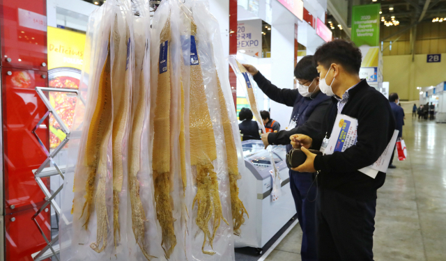 수산물 수출에 필요한 정보가 제때 제공되지 않아 수출업계가 어려움을 겪고 있다. 지난해 부산 해운대구 벡스코에서 열린 부산국제수산엑스포에서 관람객들이 수출 수산물을 살펴보고 있다. 부산일보DB